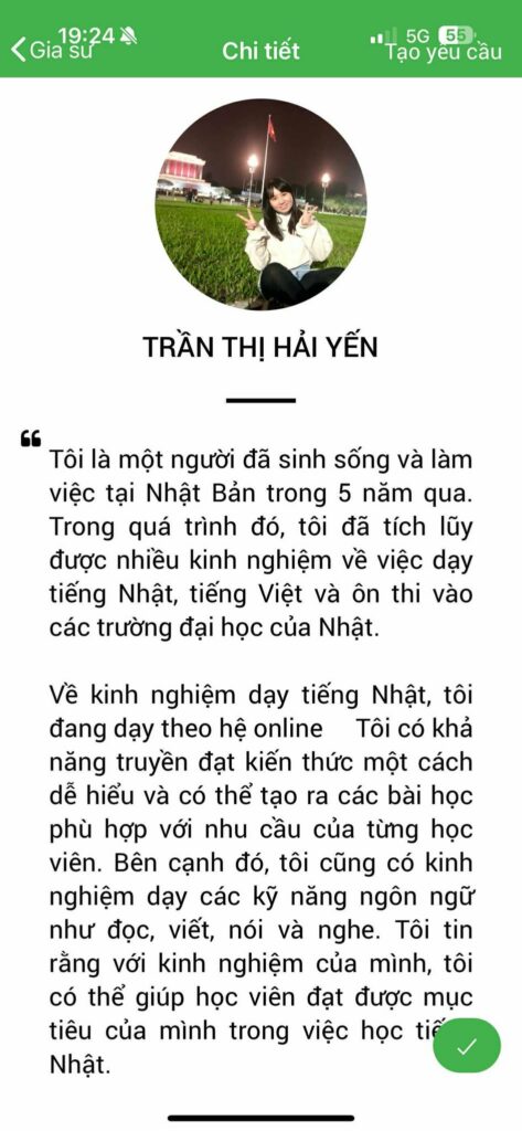 – Ngoài ra, Daykemtainha.vn còn có đội ngũ gia sư từng là du học sinh, thực tập sinh, hoặc người đã làm việc nhiều năm tại Nhật Bản. Với trải nghiệm thực tế, các gia sư sẽ mang đến những bài học gần gũi, thiết thực, giúp học viên rèn luyện kỹ năng giao tiếp tự nhiên và hiểu rõ môi trường học tập, làm việc tại Nhật.